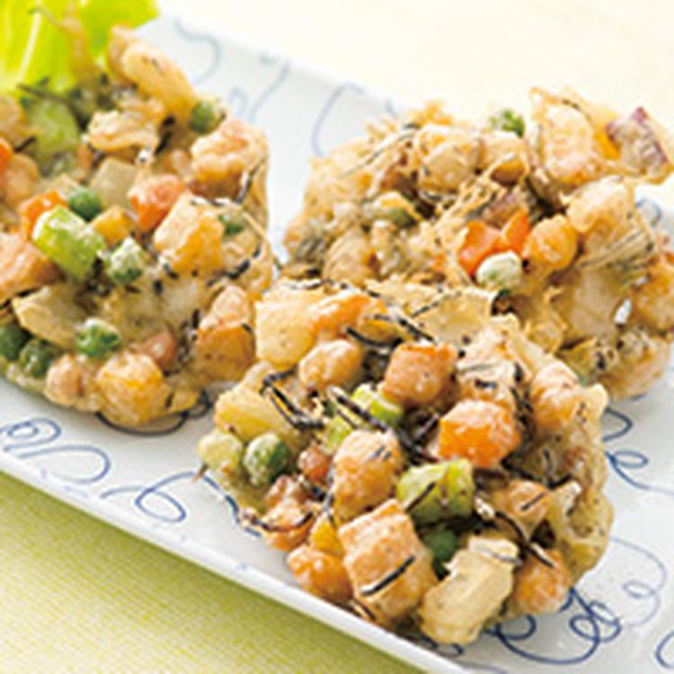 Cを合わせ、(1)、アスパラ、玉ねぎを加えてさっと混ぜ、170℃に熱した油にお玉ですくいながら入れて、からりと揚げる。
