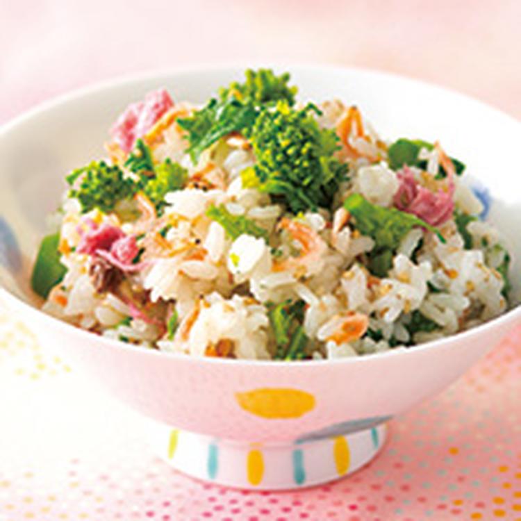 ご飯に(1)、桜えび、桜の花、ごま、めんつゆを加え、切るように混ぜて器に盛る。