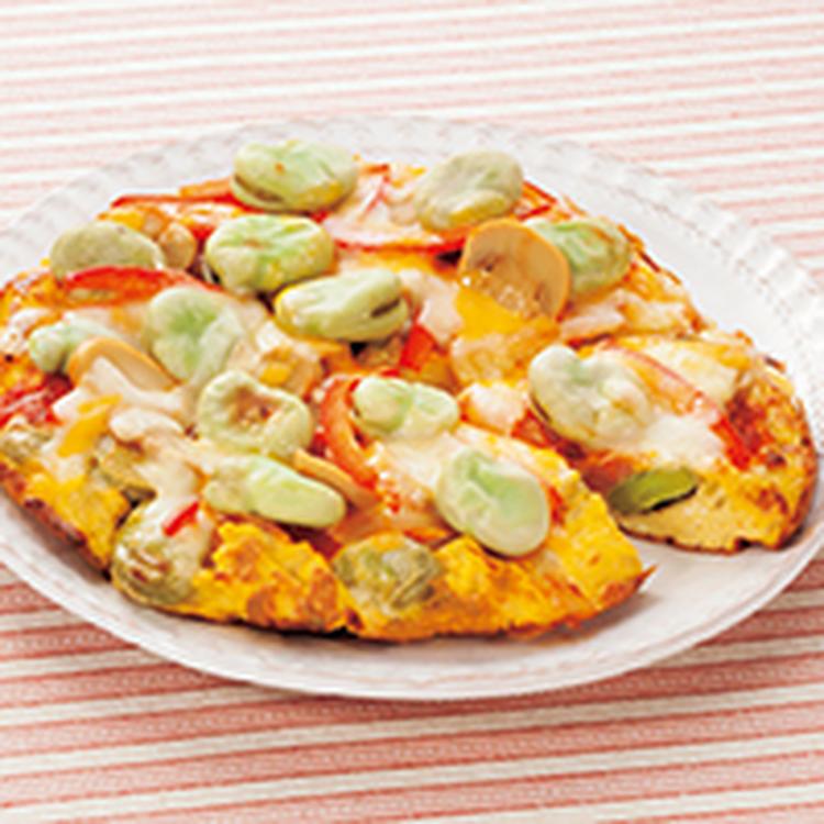 (2)にピザソースを塗ってマッシュルーム・パプリカ・残りのそらまめをのせ、チーズを散らしたらオーブントースター(1000W)で約5分焼く。