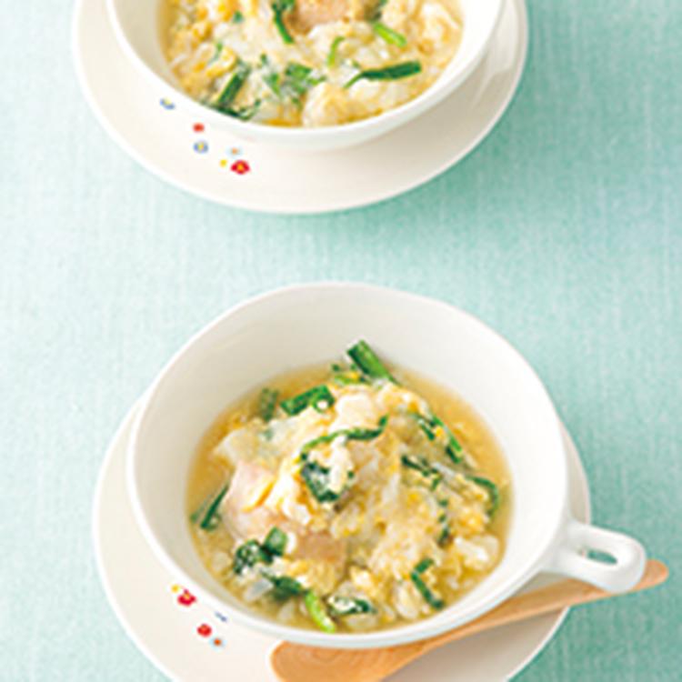 (1)にA、ご飯を入れ、ひと煮立ちさせてにらを加え、溶き卵でとじる。