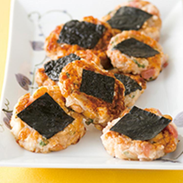フライパンにごま油を中火で熱し、スプーンで(2)を丸く落とし入れて中央に海苔を置き、2~3分焼いて返し、両面に焼き色を付ける。