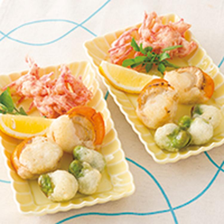 ボウルにAを合わせ、ほたて、そら豆をくぐらせ、170℃に熱した油で揚げる。