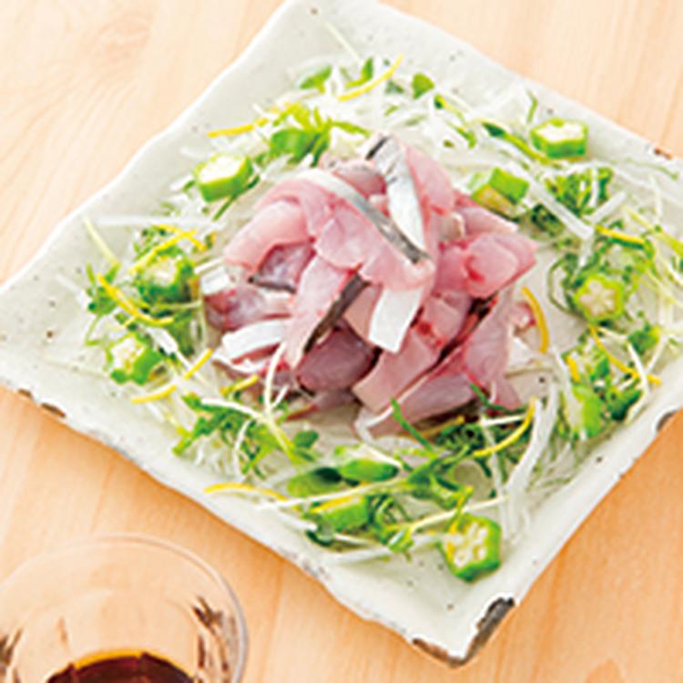 器の中心にあじを盛って(1)を周りにあしらい、ぽん酢、好みでわさびを添えて、いただく直前に和える。