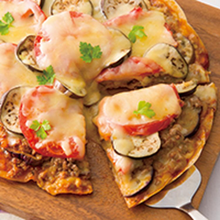 (1)のフライパンを軽く拭き、オリーブ油を薄くひく。餃子の皮を敷き詰めてピザソースを全体に広げ、なす、(1)、チーズ大さじ4、トマト、なす、トマト、チーズ大さじ4の順で重ねて蓋をし、8〜10分ほど中弱火にかける。