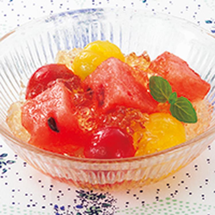 器に(1)のミニトマト・すいかを盛り、フォークでくずした(2)を盛り合わせてミントを添える。