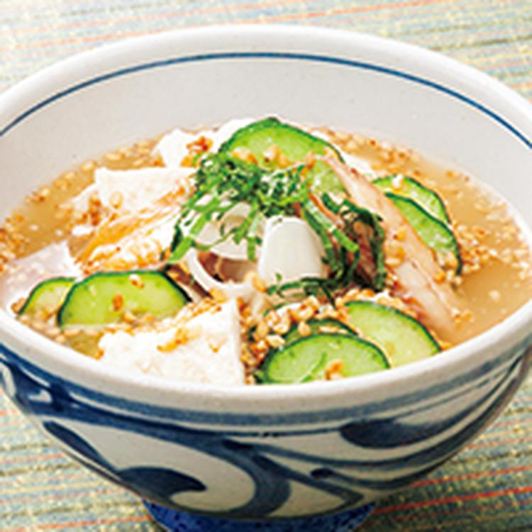 ボウルに白すりごま・みそを混ぜ合わせ、更に(1)を加えてサッと混ぜる。だし汁を加えてみそを溶かし、きゅうり・崩した豆腐・Aを入れる。