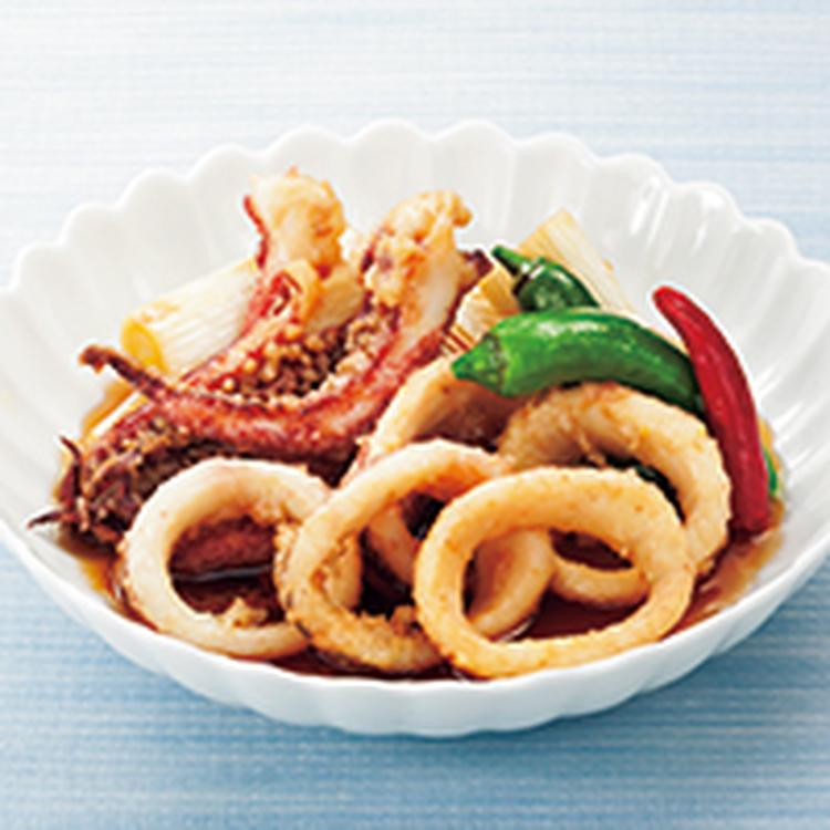 イカはワタをとり、胴は約2cm幅の輪切りにする。足は2~3本ずつに切り分け、包丁の背で吸盤をこそげる。しし唐辛子はへたの先を切り、爪楊枝で所々穴をあける。