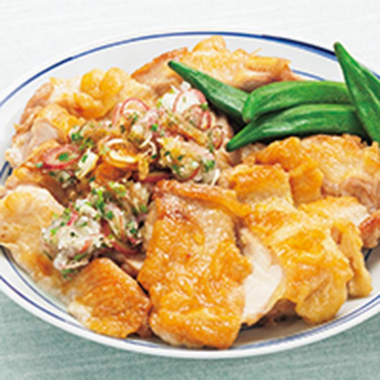 オクラはガクをとり、塩をまぶして板ずりし、ゆでて水気を切る。鶏肉は塩・こしょうを振って小麦粉をまぶす。