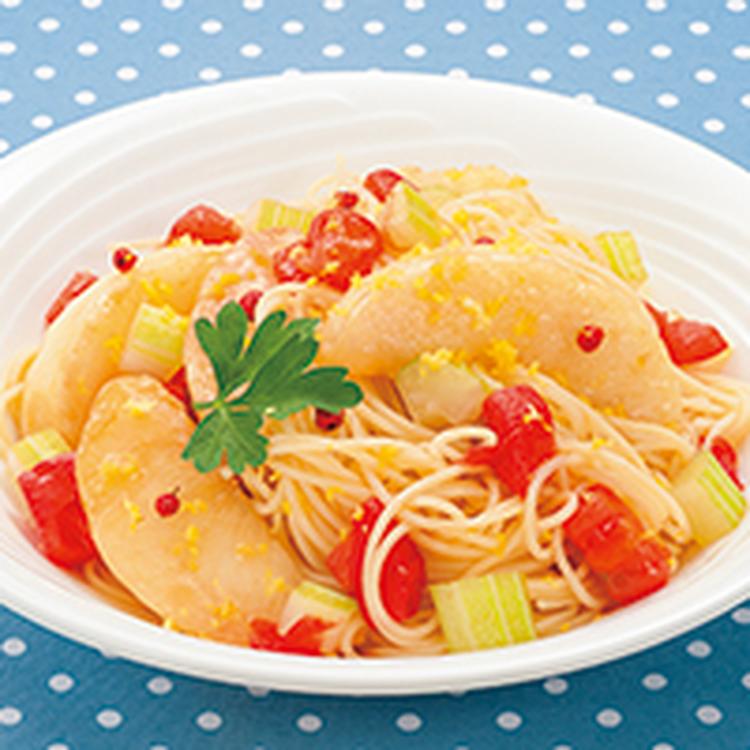 パスタをゆでる直前に白桃を湯むきし、くし形に切ってレモン汁をかける。