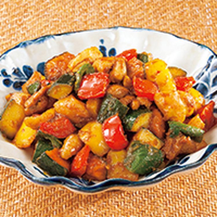 フライパンにオリーブ油・にんにくを入れて中火にかけ、香りが立ち始めたら鶏肉を入れる。こんがりと焼き色がついたらAを加え、強火にして炒め合わせる。