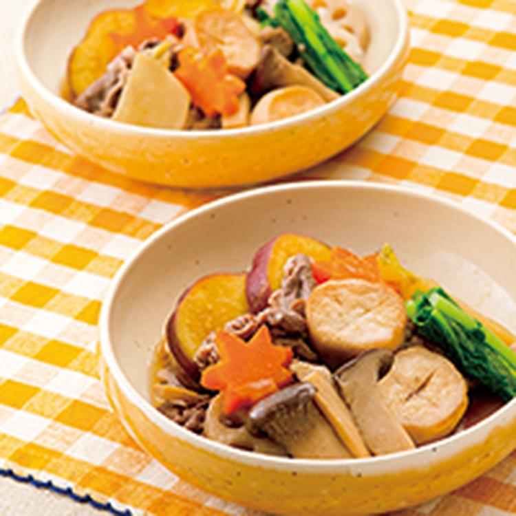 (1)にDを順に入れ、煮立ったらアクを取り、落とし蓋をして5分ほど煮、しょうゆ、A、Cを加えて蓋を取り、煮汁を全体によく絡めながら、5分ほど煮込む。