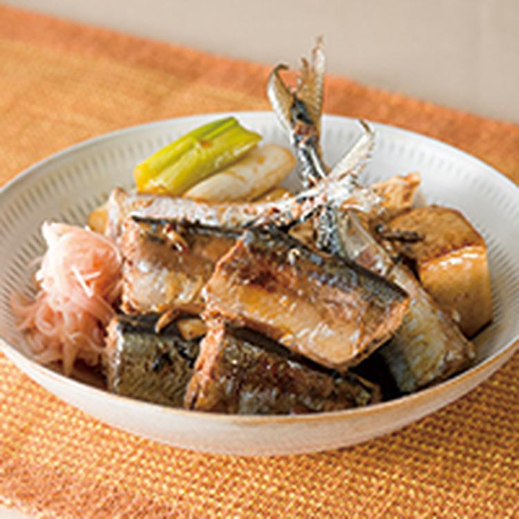 鍋にAを煮立て、さんま、焼き豆腐、長ねぎを入れ、落とし蓋をして弱火で10分ほど煮、火を強めて汁気を飛ばし、ごま油をたらす。