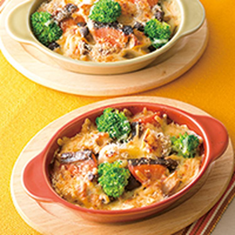 耐熱容器に(2)、ブロッコリーを入れてBをのせ、オーブントースターで7~8分焦げ目が付くまで焼く。