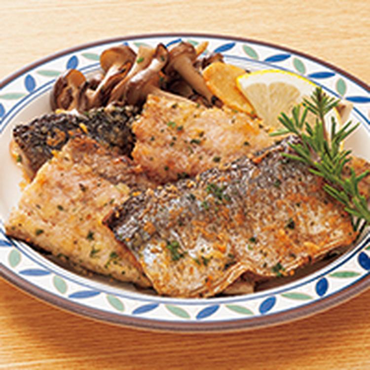 フライパンを拭き、残りのオリーブ油・にんにくを入れて弱火にかけ、香りが立ち始めたら中火にしてまいたけ・しめじを加えて炒める。Cを振って(2)に添え、レモンとローズマリーを添える。