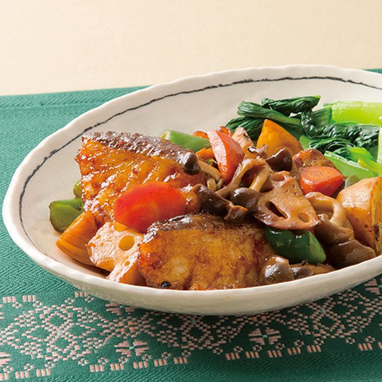 フライパンにサラダ油を多めに熱し、たらを揚げ焼きして取り出し、チンゲン菜を除く野菜を硬い順に入れて蓋をし、蒸し焼きにする。
