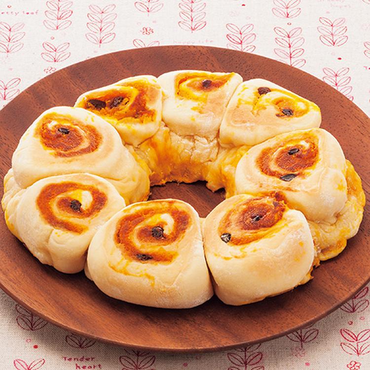 表面に溶き卵を塗り、生地のふちを残して(1)をのせる。レーズンを全体に散らして生地を手前から巻き、8等分の輪切りにする。