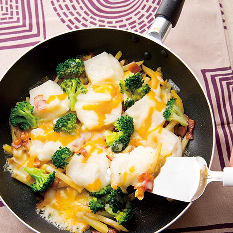 フライパンにオリーブ油を熱してベーコンを炒め、じゃがいもを加えて軽く炒め、塩、こしょうをふって、全体に広げる。