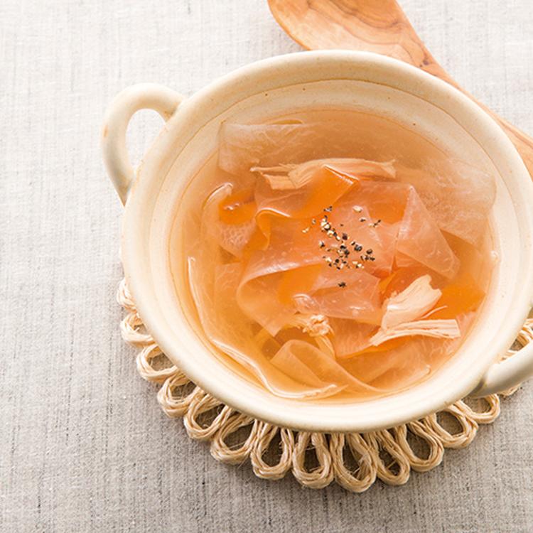 1.鍋にAを入れて弱火にかけ、煮立ったらアクを取り、極弱火にして20~30分煮て、厚めのペーパータオルを広げたざるでこす(冷蔵庫で3~4日保存可、冷凍可)。