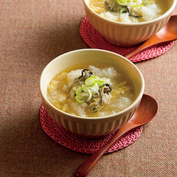 (1)に卵を細く回し入れ、ゆっくり混ぜたら大根おろしを加えてひと煮立ちする。