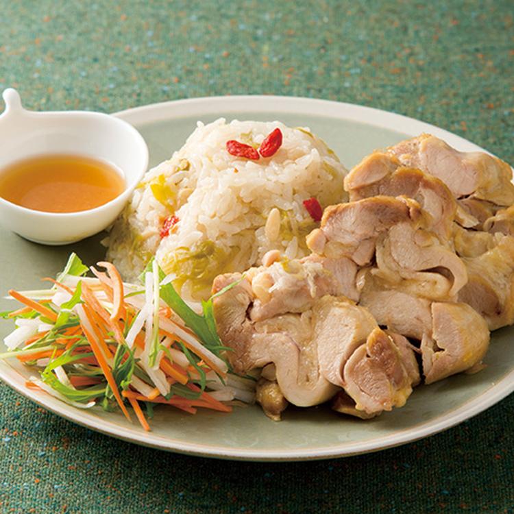 参鶏湯のスープで炊いたご飯に、茹で鶏をのせて