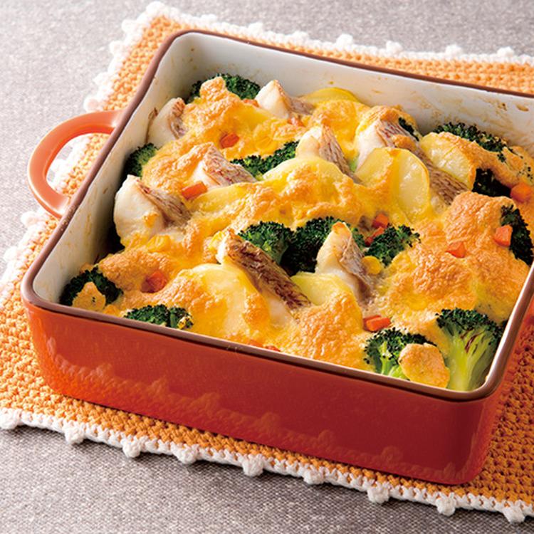 耐熱容器にバターを塗って(1)、ブロッコリーを見栄え良く並べる。鯛にバターを数か所のせて(2)をかけAを散らして、170℃に予熱したオーブンで20分ほど焼く。