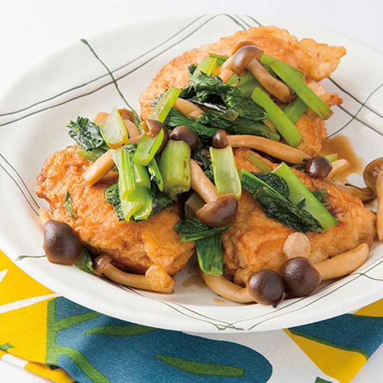 フライパンに油を熱し、しめじ、小松菜を入れて炒め、Cで味を付け、(1)を入れて火を止め、器に盛る。
