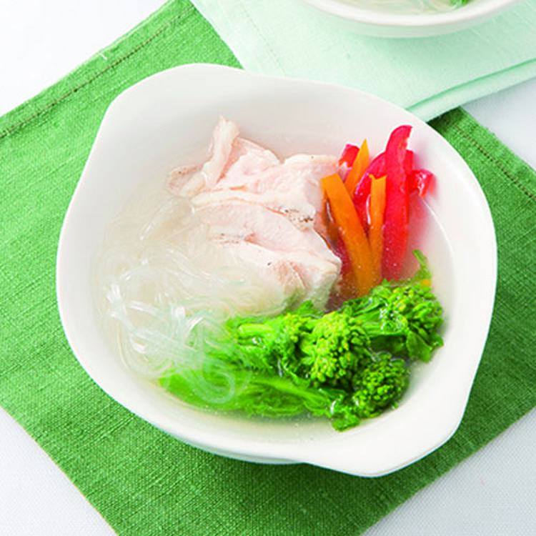 スープを作る。鍋にCを煮立ててDで調味し、具材を彩り良く盛った器に注ぐ。