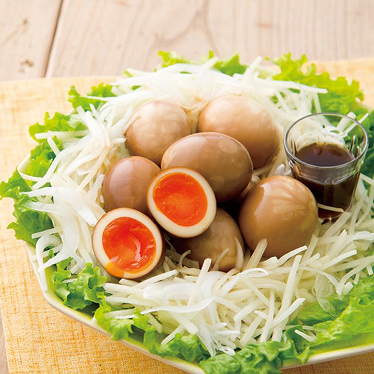 卵を茹で、殻をむいて(1)に漬け込み、冷蔵庫で1日置く。