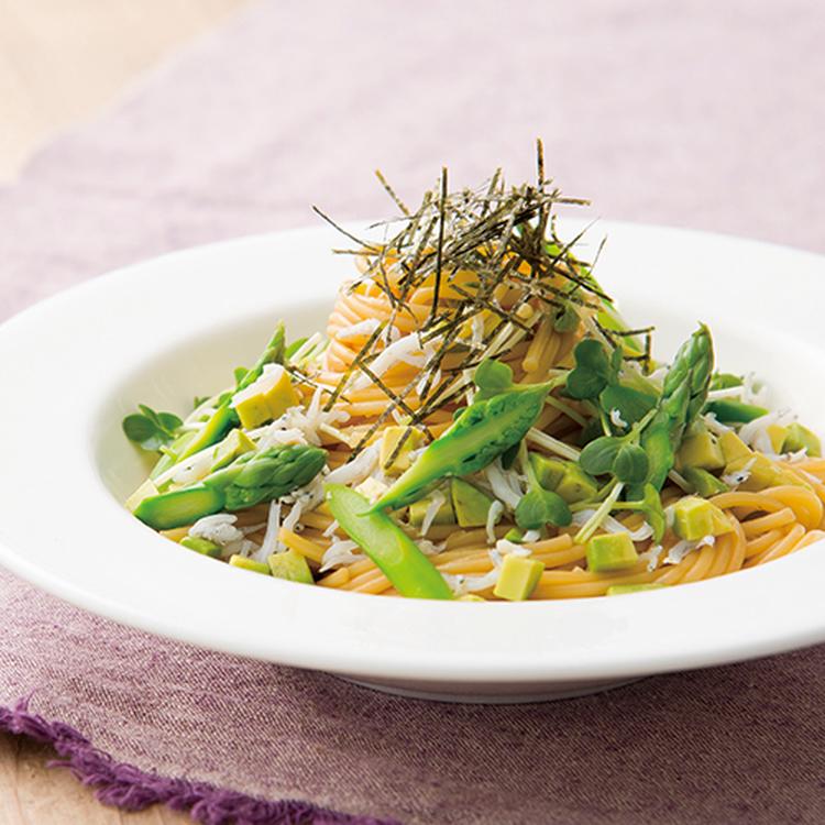沸騰した湯に塩を入れ、パスタを表示通りに茹で、ざるに上げて水気をきる。