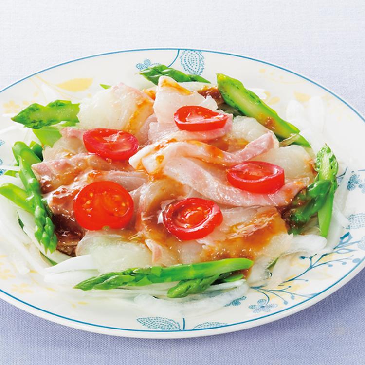 アスパラは根元の固い部分を除いてはかまを削ぎ、サッとゆでて水にさらしたら斜め薄切りにする。新玉ねぎは水にさらして水気を切る。