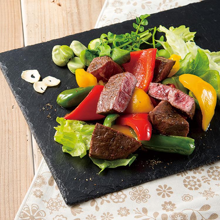 フライパンに脂を熱して牛肉を好みの焼き加減で焼き、アルミホイルに包んで少し休ませ、ひと口大に切り分ける。
