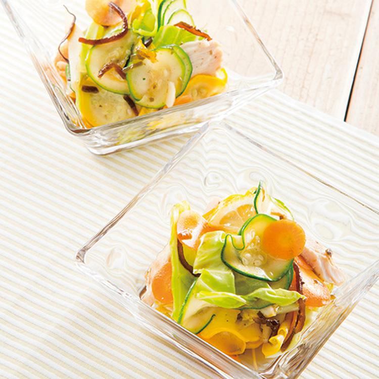 ポリ袋にA、Bを入れて野菜がしんなりするまでよくもみ、(2)を加えて全体がなじんだら器に盛る。