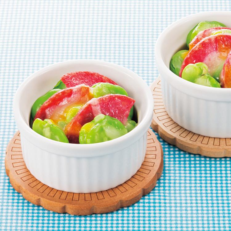 そら豆はさやを除き、塩(分量外)を加えた熱湯で約5分ゆでて薄皮をむく。