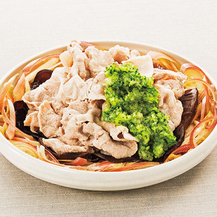 きくらげは水で戻して固い部分を除き、一口大に切って熱湯で約2分ゆでてとり出す。続いて豚肉を1枚ずつ入れ、ゆでて水気を切る。