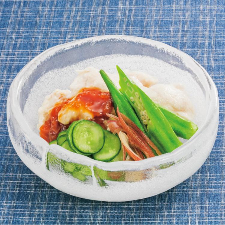鍋に水3カップを入れて強火にかけ、沸騰したらAを加えてひと煮立ちさせる。(1)を入れて浮き上がるまでゆでたら氷水にとって水気を切る。続いてオクラをさっとゆで、氷水にとって水気を切り、ヘタを落として斜め2等分にする。