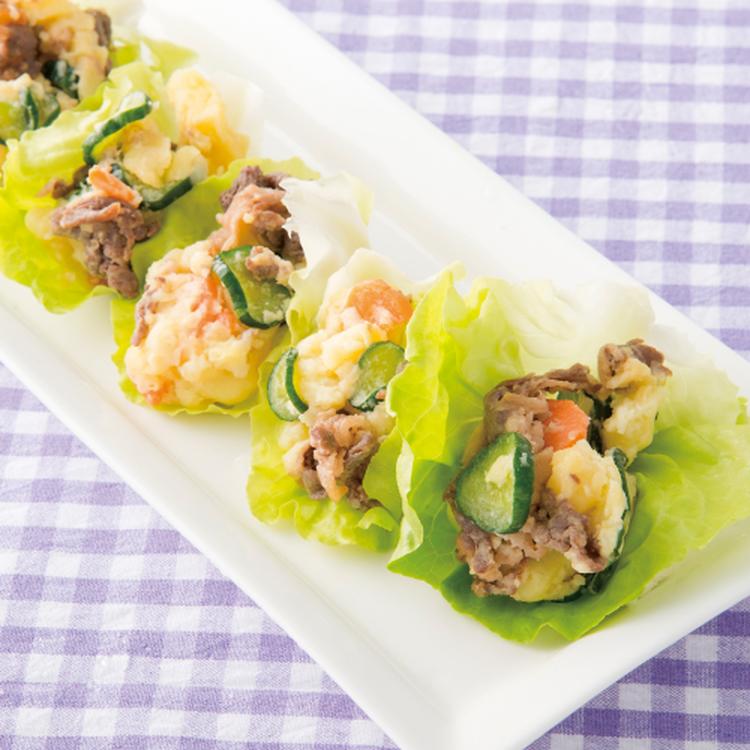 いつものポテサラに炒めた牛肉を入れて、ボリュームアップ。