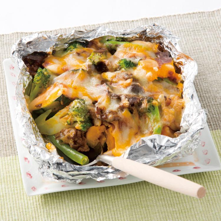 アルミホイルで器を作って(2)を入れ、カレーをかけチーズをのせ、オーブントースターでチーズが溶けるまで焼く。