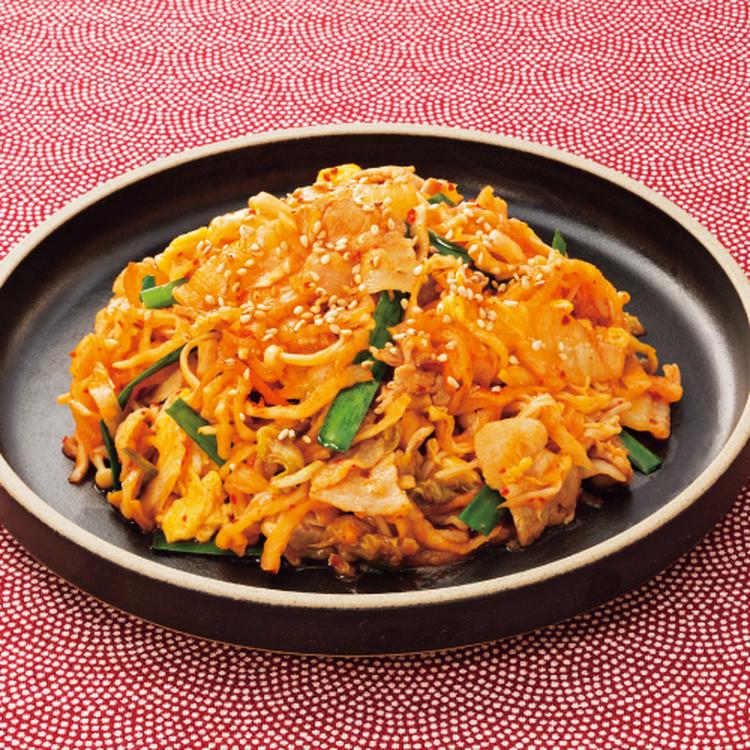 フライパンにごま油を中火で熱して豚肉を炒め、色が変わったら(1)・Aを加えてサッと炒める。めんつゆ・水大さじ3を加えて混ぜ合わせ、中身をフライパンの端に寄せる。空いたスペースに溶き卵を流し入れて大きくかき混ぜ、半熟状になったらにらを加えて全体を炒め合わせる。