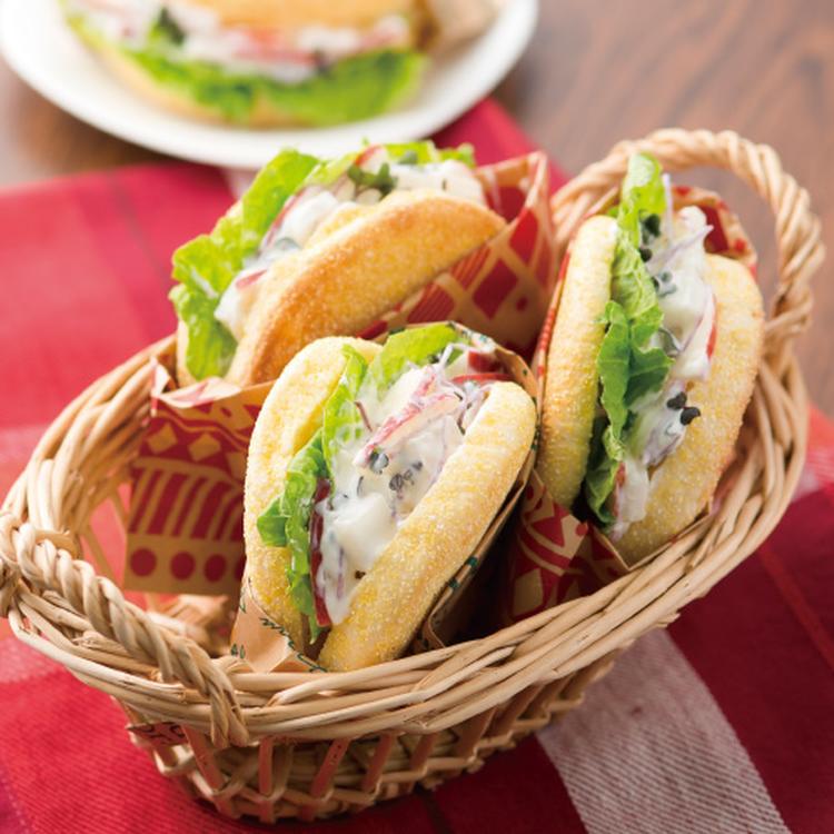 (2)に白菜、(1)の順に挟んでマフィンを少し押しつぶし、全体をなじませたら紙に包み、盛り付ける。
