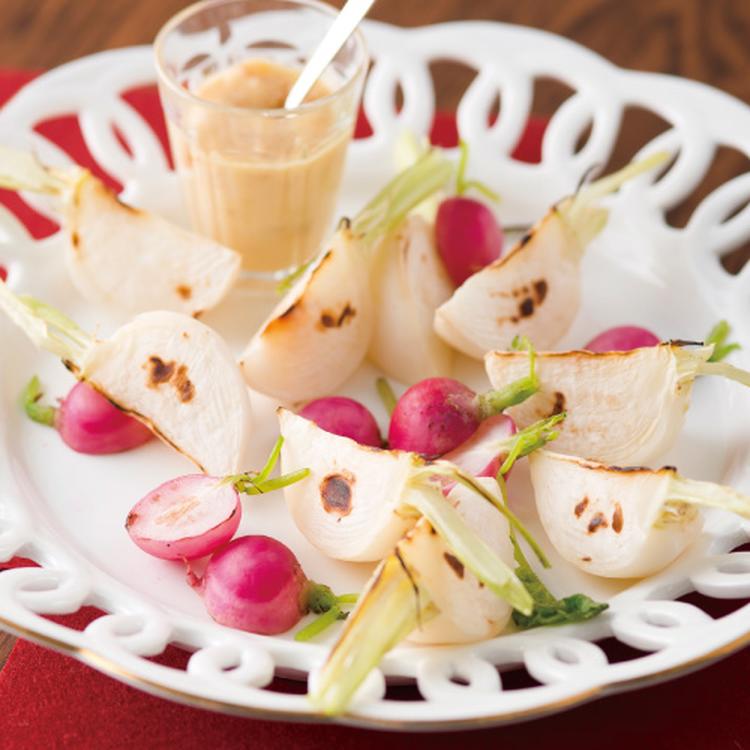 フライパンを中火で熱して小かぶ、ラディッシュを並べて入れ、返しながら全体に焼き色をつける。