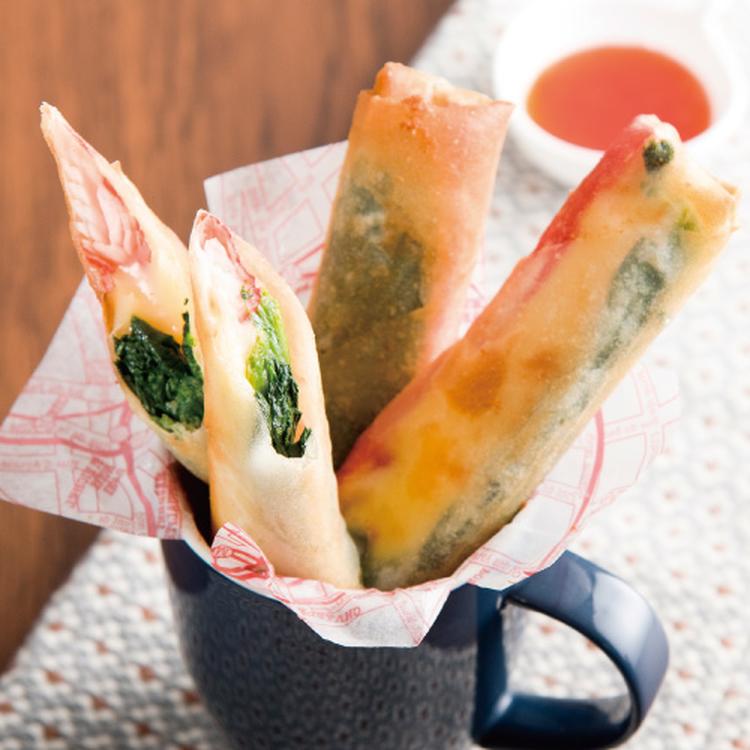春巻きの皮を広げ、ほうれん草の葉と茎の8分の1量を置き、チーズ、かにかまも同様に並べて巻き、巻き終わりにAをつけて留める。