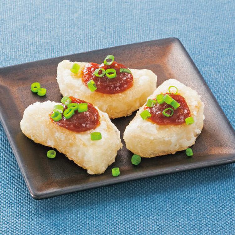 (1)の水気を拭いて片栗粉をまぶし、中温に熱した揚げ油でキツネ色になるまで揚げる。