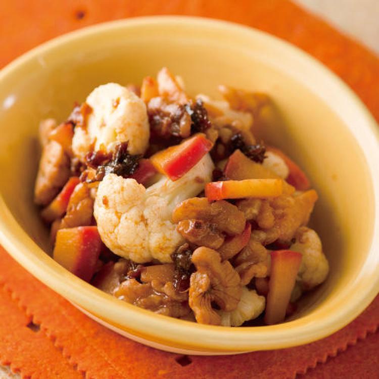 大きめのボウルにカリフラワーを入れ、(2)を加えてさっくり混ぜ、リンゴ酢をかけていただく。