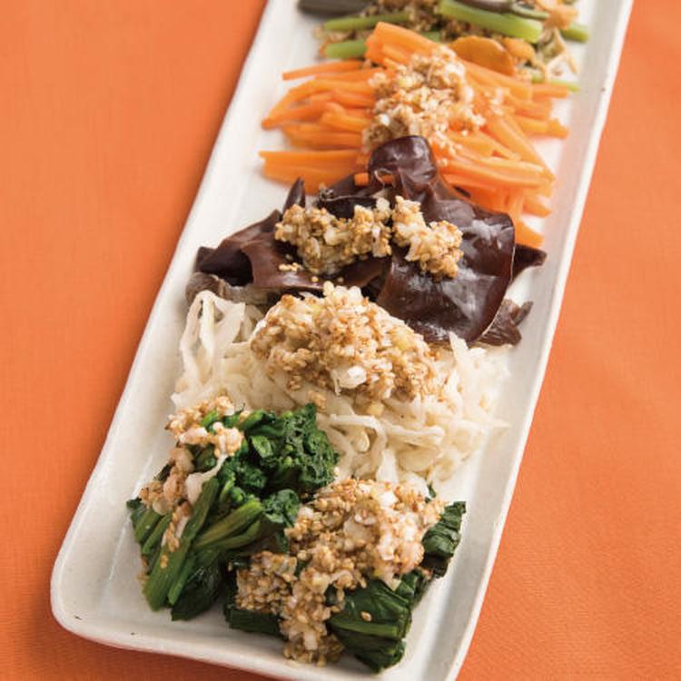 Aを食材別にまとめて耐熱容器に入れ、(1)を回しかけてラップをし、電子レンジ500Wで2分加熱して、器に盛り温かいうちにいただく。