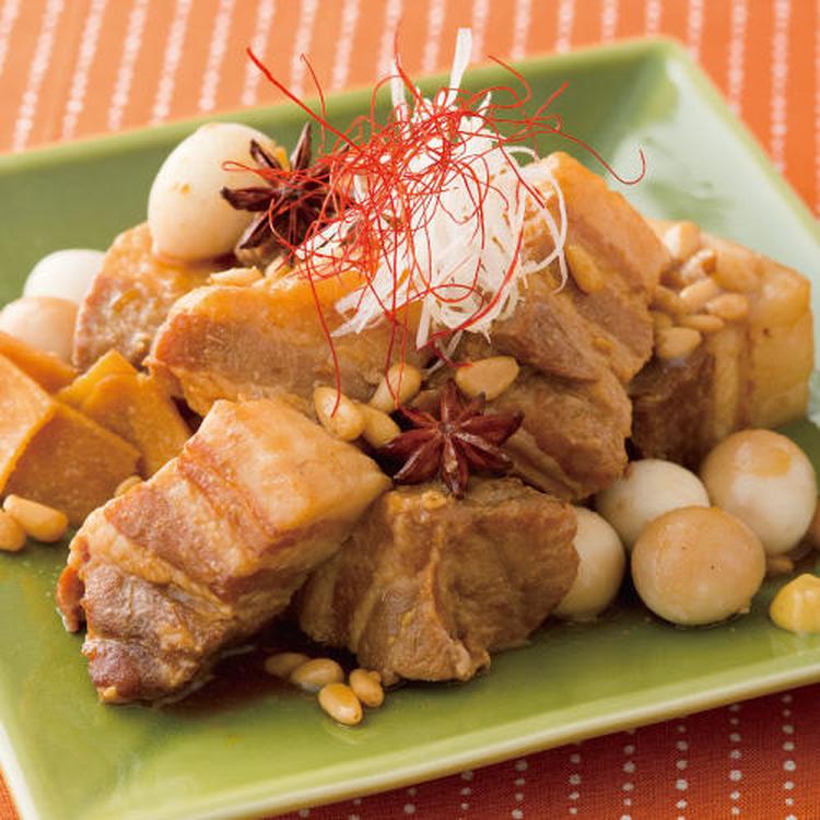 豚肉に竹串を刺して肉汁が透き通っていたら、具材を取り出して器に盛り、脂を除いた煮汁をかけて、Bをのせる。