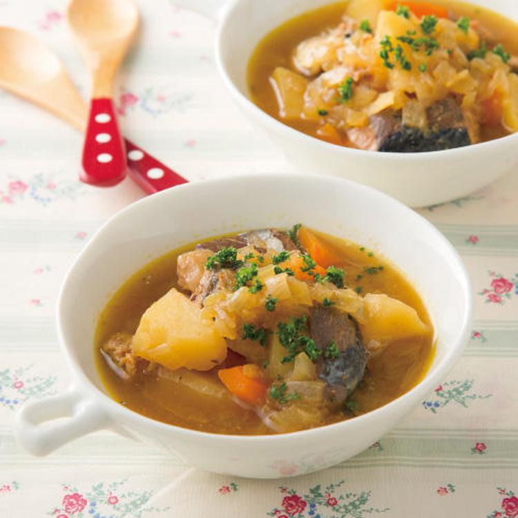 (2)のじゃがいもが軟らかくなったらBを入れて煮、さばを加える。