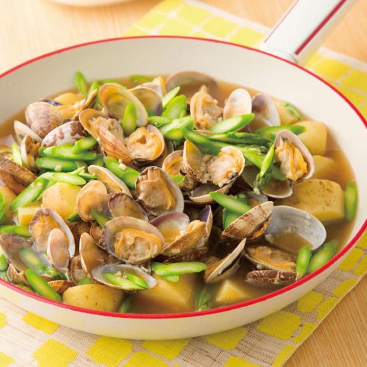 あさりの殻が開いたら、A、Bを加えてひと煮立ちさせる。