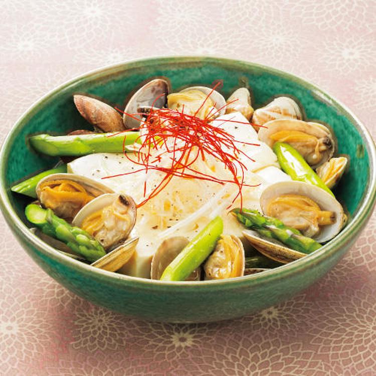 アサリの口が開き始めたらアスパラを全体に散らし、更に約4分蒸す。器をとり出してAをのせる。