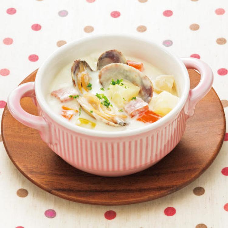 (1)のアサリを戻し入れ、Bを加えてひと煮立ちしたら塩・こしょうで味を調える。器に注いでパセリを散らす。