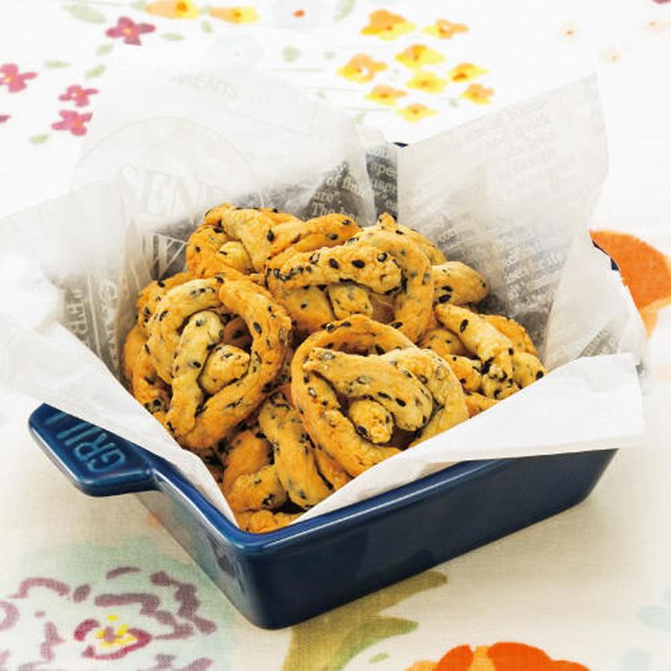 小麦粉(分量外)を振った台に(1)をのせて20等分に切り、1切れを転がしながら約20cm長さのひも状に伸ばす。両端を持ち上げて中間をねじり、手前に折り返して輪の中に留める。これを計20個作り、オーブンシートを敷いた天板に並べる。